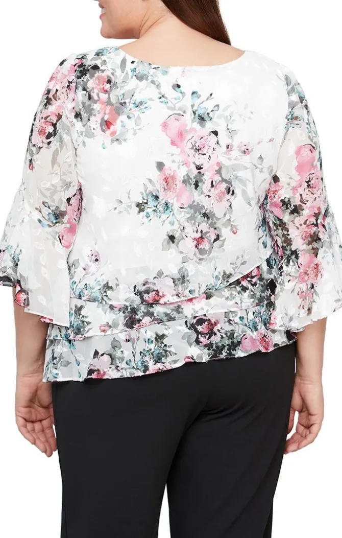 Plus 3/4 Sleeve Printed Chiffon Blouse With Triple Tier Asymmetric Hem & Bell Sleeves