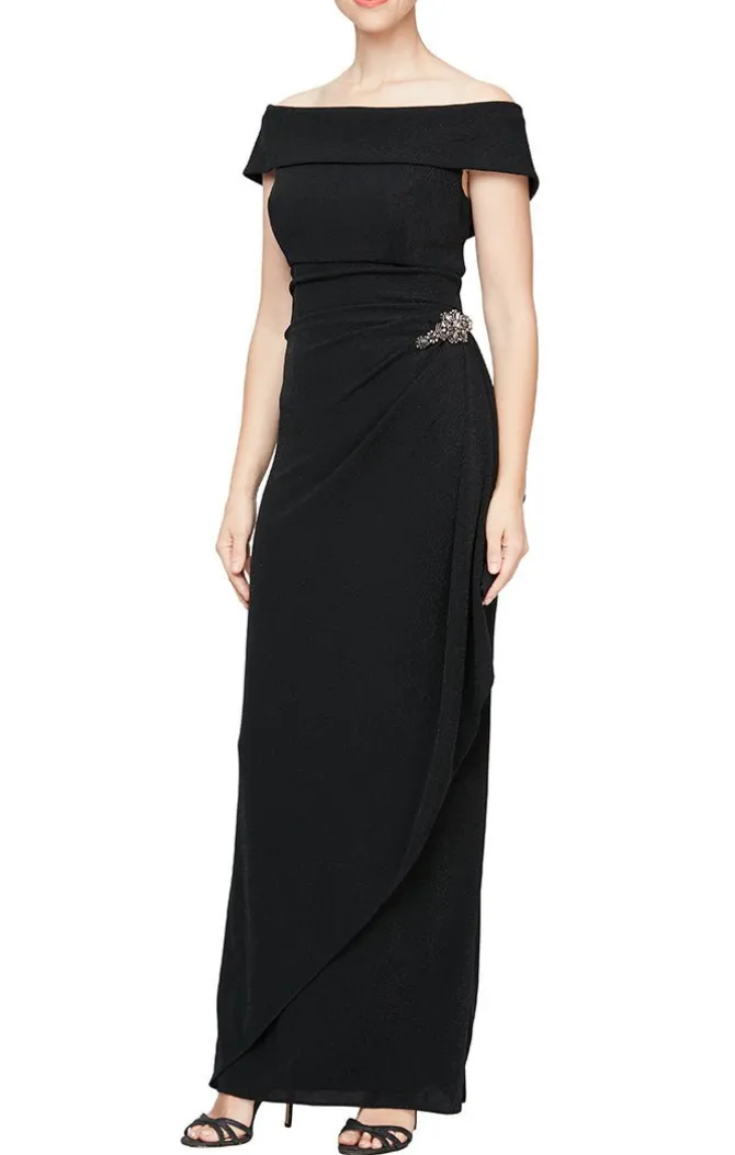 This Classic Black Long Dress With Foldover Neckline And Beaded Detail At Hip It Offers A Timeless Silhouette For Any Occasion. With It’S Shimmering Metallic Knit Fabric And Captivating Neckline, This Dress Is Sure To Make A Statement.