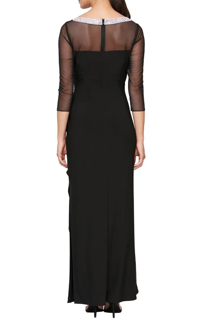 Petite Long Matte Jersey Illusion 3/4 Sleeve Side Ruched Dress With Embellished Neckline