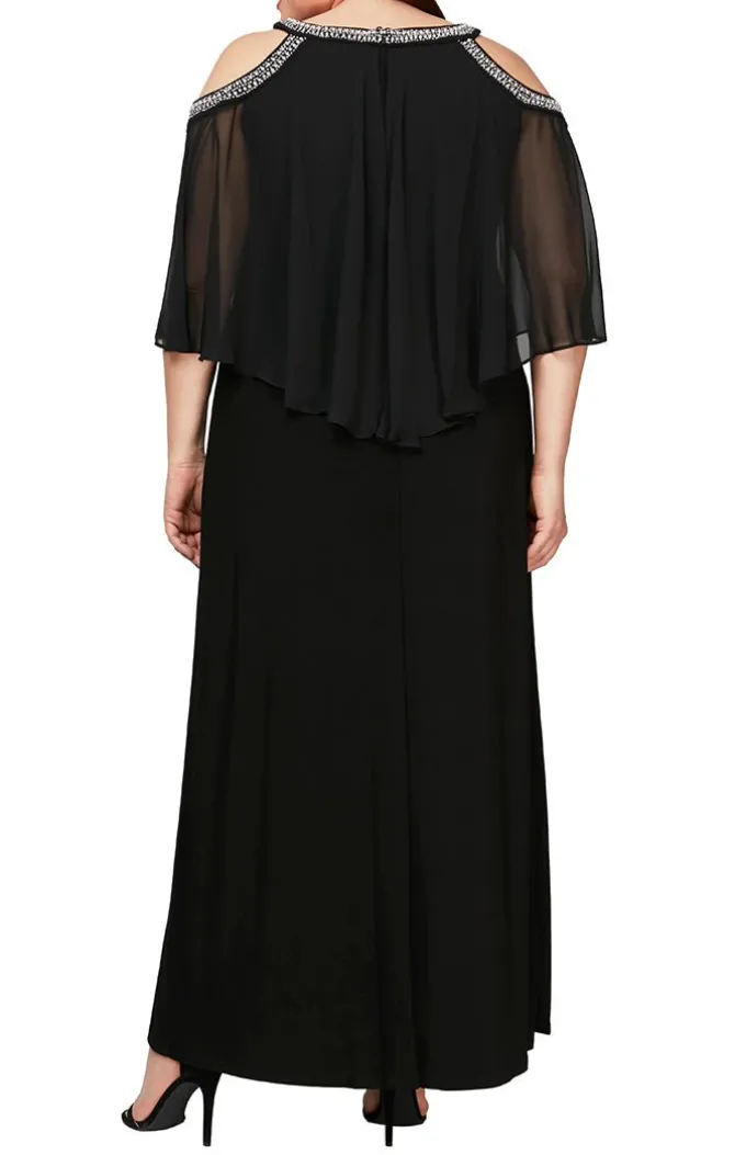 Plus Cold Shoulder Popover Jersey & Chiffon Gown With Beaded Neckline
