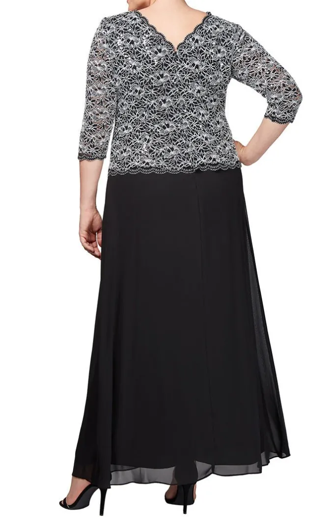 Plus Long Gown With Lace Bodice With 3/4 Illusion Sleeves, Scalloped Hem Detail And Chiffon Skirt